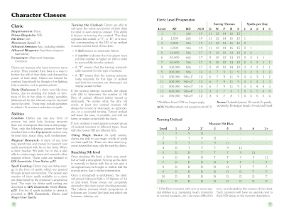 Look at the dwarf class. Seems simple enough, right? But then look at where the information is collated from. The main class description is on B9. The XP and HD advancement table for levels 1-3 is on B8. Of course, the chart for advancement beyond 3rd level is on X5. Then the description of the class features for levels 3-14 is on X7. Then you have the table for saving throws on X24 and the attack table on X26. And then the dwarf's ability at finding traps is hidden away on B22. And the rule about dwarves and other demi-humans having an improved chance when listening at doors on B21.