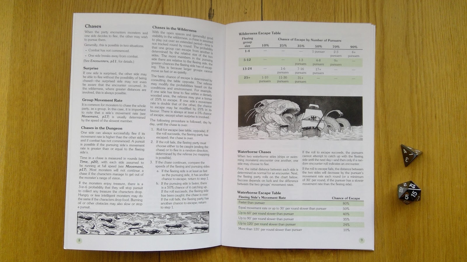 | Rules for chases in dungeons, wilderness, and at sea, all on one spread. |